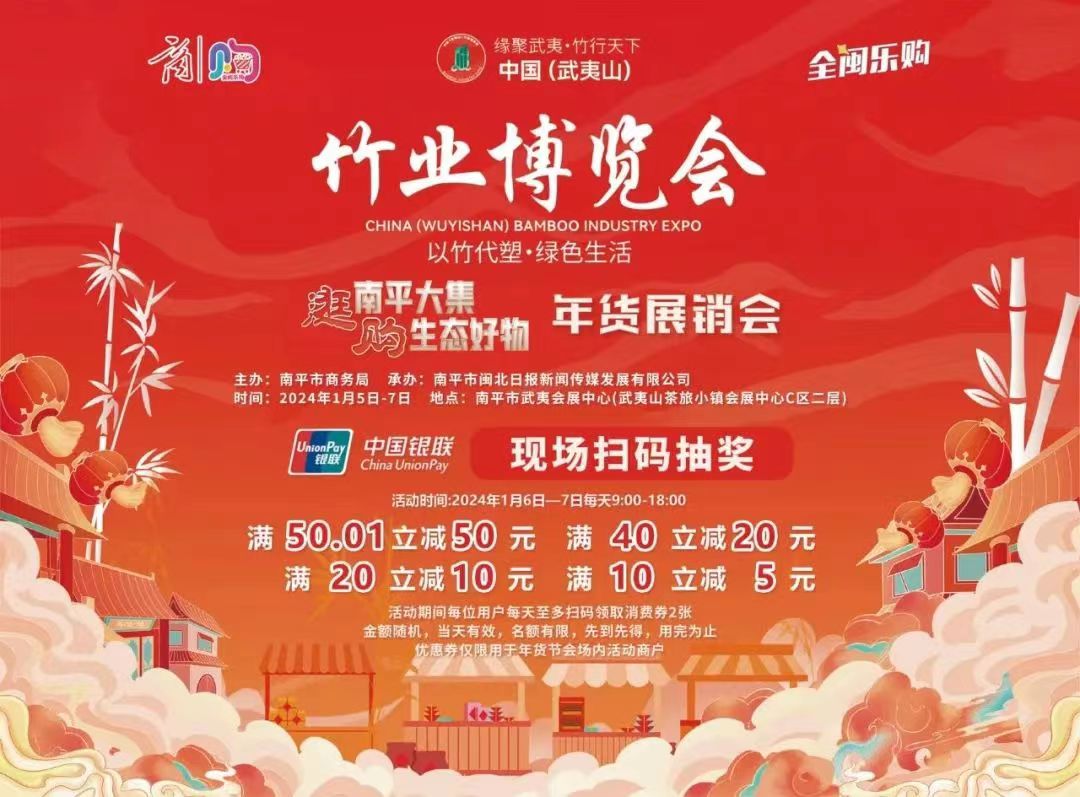 南平竹博会期间还开展了闽北名小吃、笋竹预制菜美食推广以及年货节等促消费活动,“南平大集”年货区则大量使用竹木、布艺等替代塑料制品,设置了大量休闲互动和优惠活动,金融机构为武夷学院师生配套了专属惊喜福利,让大家更关注南平竹业。