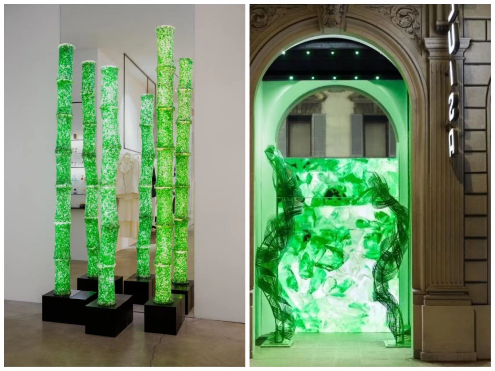 祝愿各位朋友在新的一年里,竹龙自腾飞,竹马伴青梅!2月6日,中国艺术家 Sean WuLuisaViaRoma在 佛罗伦萨门店,以竹子为核心元素打造了一个沉浸式店内艺术装置。两座高度超过4米的竹子制成雕塑,两条如游龙般形状的装置盘旋在外部拱门两端,“游?”全身实由竹签打造,拱?外屏幕上播放着与竹子艺术有关的视频短片。