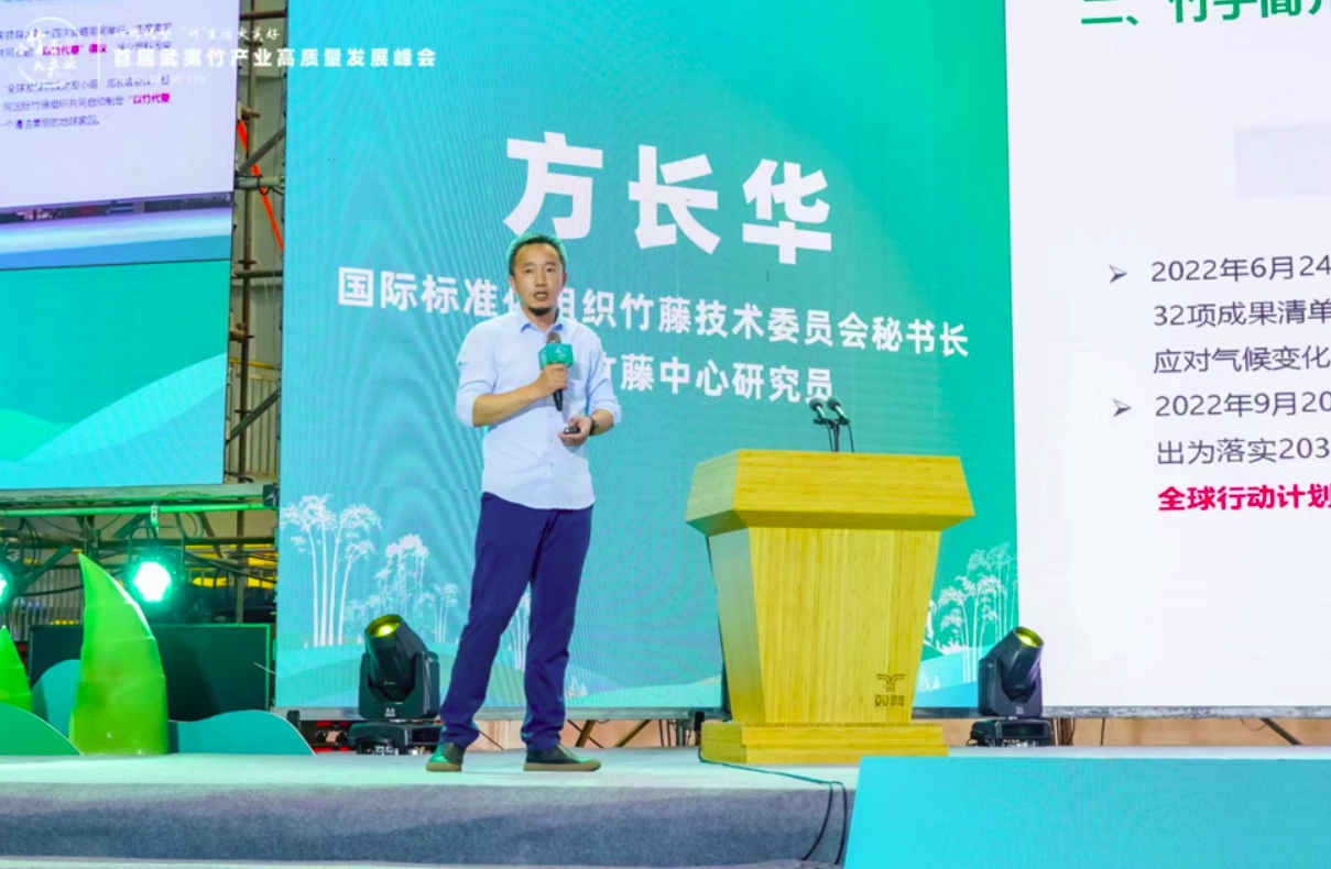 26日下午,首届武夷竹产业高质量发展峰会主论坛成功举办,中国竹产业协会副会长丁雨龙主持论坛。南平市人民政府副市长杨新强致辞,中国林科院首席科学家、国家竹产业研究院院长于文吉作了题为《我国竹产业高质量发展创新途径与发展模式的思考》主题报告,国际竹藤中心研究员王戈作了题为《世界竹产业发展趋势研究》主题报告,国际标准化组织竹藤技术委员会秘书长、国际竹藤中心研究员方长华作了题为《以竹代塑产品分类及其标准》主题报告,中国林业科学研究院亚热带林业研究所研究员傅金和作了题为《以竹代塑,减塑降碳,可持续发展》主题报告,深圳湖工大包装技术研究院常务副院长,中山大学博士、教授戴武军作了题为《合成生物以竹代粮、以竹代塑关键核心技术及其应用》主题报告。