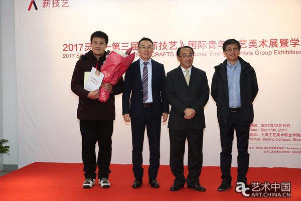 清华大学美术学院副院长马赛、上海工艺美术职业学院原院长、上海国盛集团副总裁姜鸣、辽宁成大国际贸易有限公司总经理金春洙为获得金奖的学生颁奖并合影